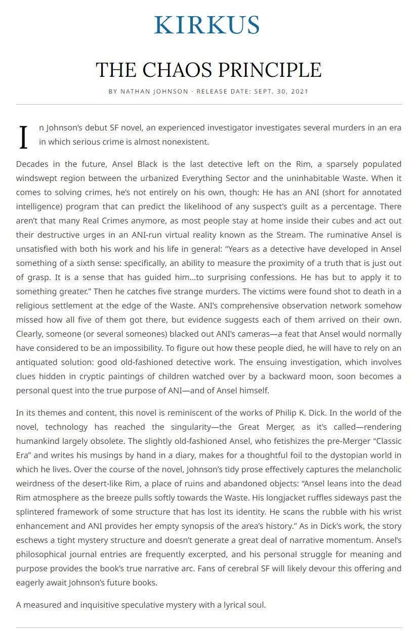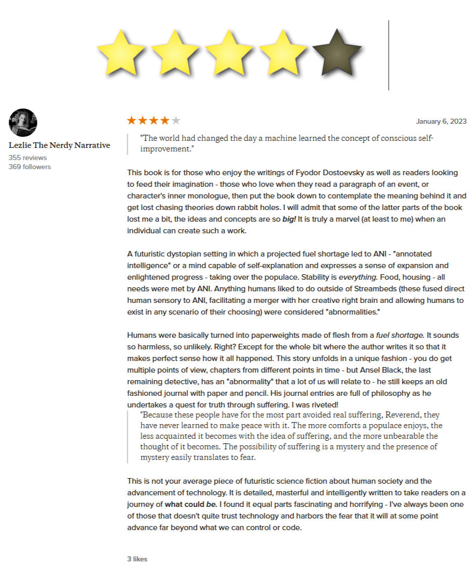A MYSTERY CAN REQUIRE A SERIES OF OTHERWORLDLY DISCOVERIES... AND THE SPACES BETWEEN ARE WHERE THE GODS DWELL.In the Rim, a forsaken wilderness that abuts a vacuous geographical nightmare that is the Waste, there are no more detectives. Except for Ansel Black. With the help of an evolved artificial intelligence named ANI, Ansel is tasked with solving five anomalous murders, within a world where the reclusive populace has lost its taste for lawlessness.His search leads to cryptic graffiti and otherworldly paintings that point to life beyond ANIβs virtual world, the Stream. But the more Ansel discovers about the five victims, the more he explores how little he knows about himself, or the world around him.Ansel is solving a traditional mystery. But life is a greater one.