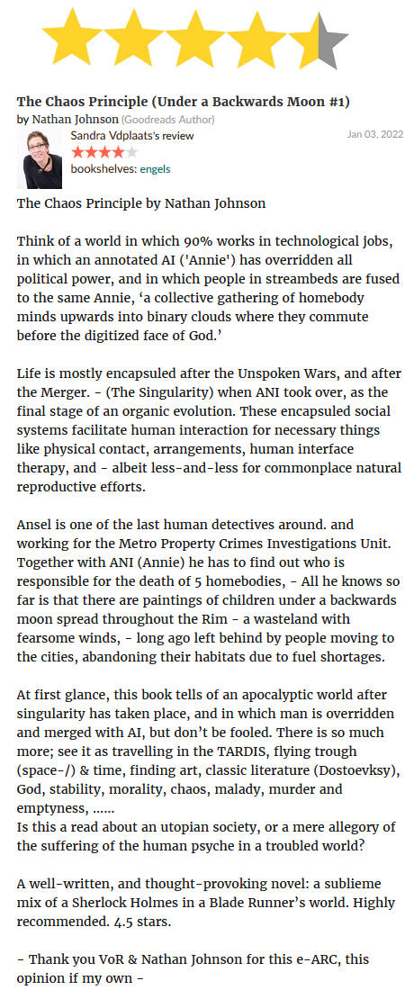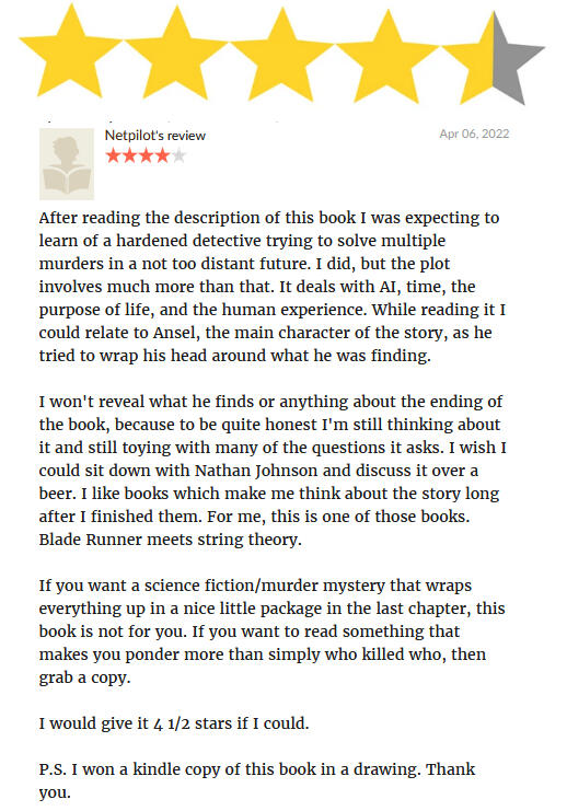 A MYSTERY CAN REQUIRE A SERIES OF OTHERWORLDLY DISCOVERIES... AND THE SPACES BETWEEN ARE WHERE THE GODS DWELL.In the Rim, a forsaken wilderness that abuts a vacuous geographical nightmare that is the Waste, there are no more detectives. Except for Ansel Black. With the help of an evolved artificial intelligence named ANI, Ansel is tasked with solving five anomalous murders, within a world where the reclusive populace has lost its taste for lawlessness.His search leads to cryptic graffiti and otherworldly paintings that point to life beyond ANIβs virtual world, the Stream. But the more Ansel discovers about the five victims, the more he explores how little he knows about himself, or the world around him.Ansel is solving a traditional mystery. But life is a greater one.